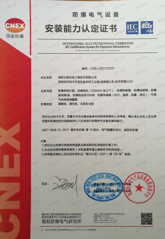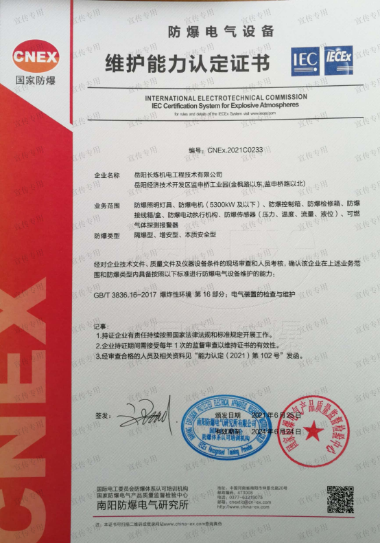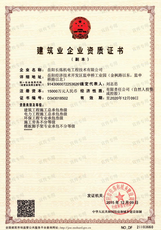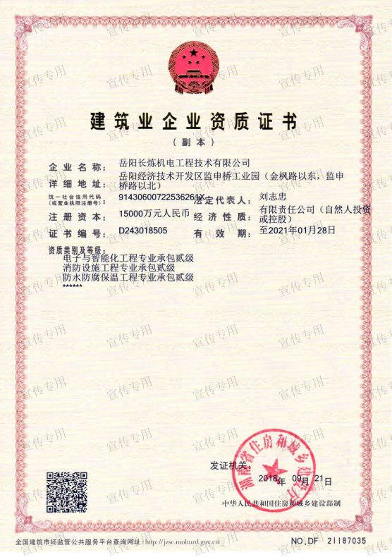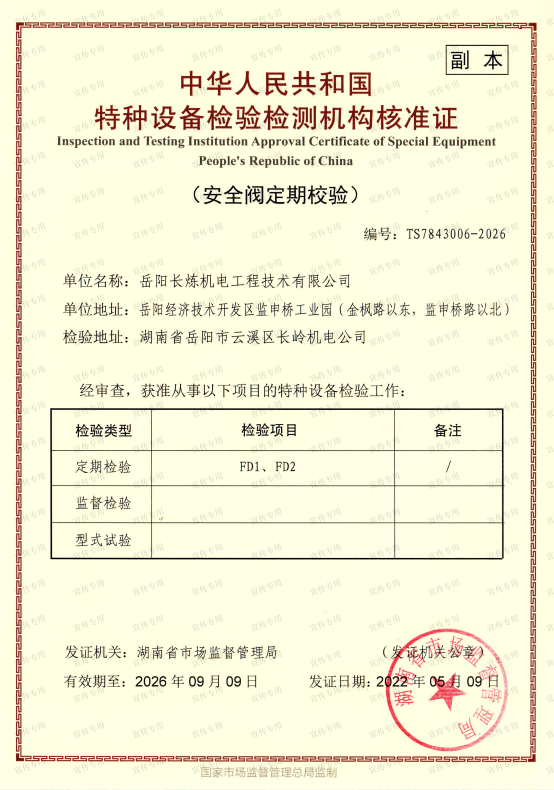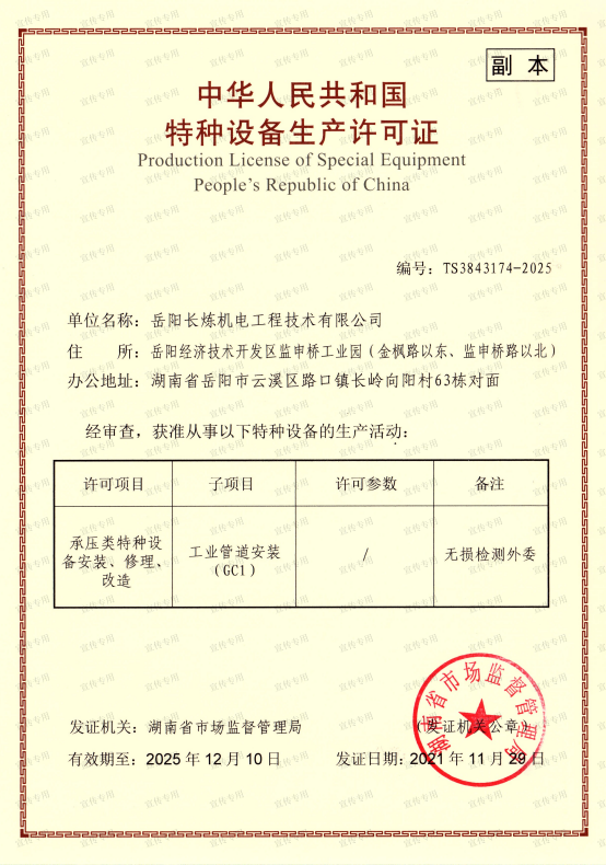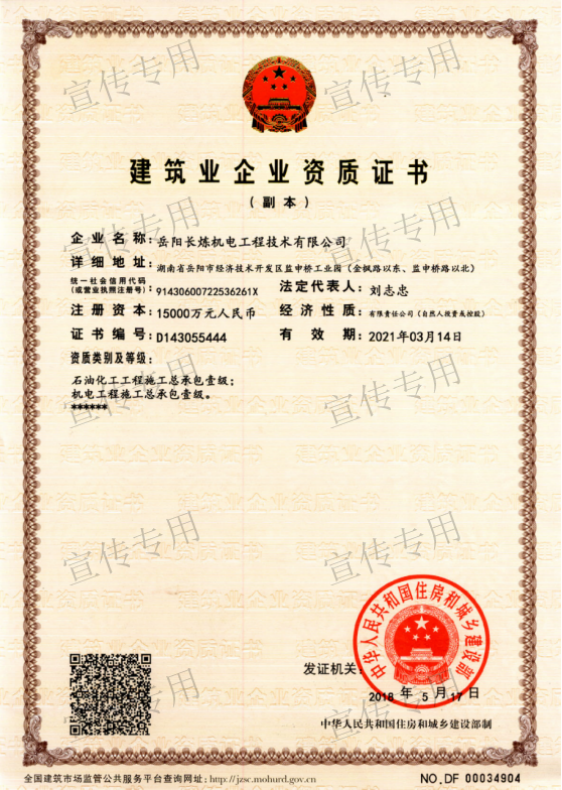 公司擁有石油化工工程施工總承包壹級資質(zhì)、機電工程施工總承包壹級資質(zhì)、檢維修能力評定(9大類38項)、建筑工程施工總承包叁級資質(zhì)、電力工程施工總承包叁級資質(zhì)、環(huán)保工程專業(yè)承包叁級資質(zhì)、消防設(shè)施工程專業(yè)承包貳級資質(zhì)、防水防腐保溫工程專業(yè)承包貳級資質(zhì)、電子與智能化工程專業(yè)承包貳級資質(zhì)、施工勞務(wù)不分等級資質(zhì)、兩化(工業(yè)化、信息化)融合管理體系認證、A級工業(yè)設(shè)備高壓水清洗資質(zhì)、特種設(shè)備生產(chǎn)許可證(中、低壓壓力容器制造(含安裝、修理、改造)(D))、特種設(shè)備安裝改造維修許可證(壓力管道)GC1級、特種設(shè)備安裝改造維修許可證(鍋爐)1級、特種設(shè)備安裝改造維修許可證(起重機械)B級;特種設(shè)備檢驗檢測機構(gòu)核準證(安全閥定期校驗)檢驗項目FD1、FD2、承裝(修、試)電力設(shè)施許可證(承裝類二級、承修類二級、承試類三級)、防爆電氣設(shè)備安裝、修理資格證書、計量標準考核證書的二氧化硫氣體檢測儀檢定裝置、硫化氫氣體檢測儀檢定裝置、熱電偶標準裝置、可燃氣體檢測報警器檢定裝置、精密壓力表標準裝置、一氧化碳檢測報警器檢定裝置等企業(yè)資質(zhì)。公司通過了中國質(zhì)量認證中心QHSE管理體系認證,是中石化施工企業(yè)資源庫A庫成員,湖南省建設(shè)網(wǎng)成員單位,湖南省高新技術(shù)企業(yè)。